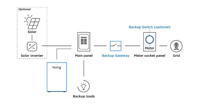A partial home backup is designed to store energy from the grid or solar, and can power some home loads during a grid outage. These loads are selected during the system design phase, and the installer configures the system at installation to exclude all other loads from backup.